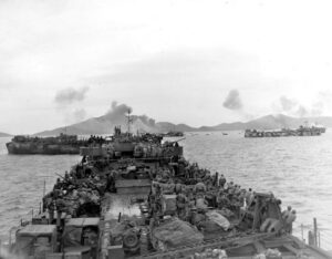 Jamais les États-Unis n’avaient rassemblé une telle flotte dans le Pacifique : 1300 navires, un demi-million d’hommes, sans compter l’appui de la Royal Navy qui, en se positionnant entre Formose et Okinawa, empêchera tout renfort japonais d’accéder à l’île en enfermant le secteur.