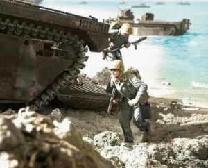 La photo de ces Marines de la 6ème Division débarquant sur Okinawa est un moment suspendu dans le temps, un intervalle entre deux horreurs. Ces hommes jeunes ne sont pas encore des héros ; ce sont des enfants remplis d’effroi, mais conscients de faire leur devoir. Ils ne savent pas encore que cette île sera le dernier témoin d’une grande bataille de la guerre du Pacifique, ni que leur courage changera le cours de l’histoire. Mais ils avancent, droit vers la tempête ; vers le « typhon d’acier ».