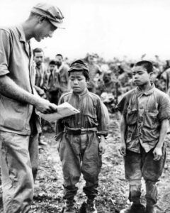 Deux Tekketsu Kinnōtai (enfants soldats japonais) Sur cette photo saisissante, prise en juin 1945, un Marine essaie d’établir un contact humain avec deux enfants soldats japonais capturés sur l’île d’Okinawa. L’image à elle seule résume toute l’ambiguïté d’une guerre totale, entre la rigueur impitoyable du conflit et les formes d’humanité qui peuvent subsister malgré tout. À Okinawa, la population civile fut entraînée dans une spirale de violence sans précédent, jusqu’au fanatisme. Le régime impérial japonais, refusant toute idée de reddition, arma jusqu’aux enfants et aux personnes âgées, les poussant à combattre ou à se suicider plutôt que de se rendre. Ces jeunes garçons sur la photo, hagards, traumatisés, vêtus de haillons militaires trop grands pour eux, sont le visage tragique d’une propagande aveugle, qui a sacrifié une génération entière au nom de l’honneur. Le Marine debout devant eux n’affiche ni arme, ni regard hostile. Il essaie de parler, d’expliquer, de rassurer. C’est un moment suspendu dans l’horreur de la bataille d’Okinawa, qui fut l’une des plus sanglantes du conflit : plus de 200 000 morts, dont près de la moitié étaient des civils. Cette scène reflète aussi un changement de perception chez les forces américaines. Loin de l’image caricaturale de l’ennemi, ces enfants capturés rappellent aux soldats alliés que l’adversaire n’est pas toujours un combattant volontaire, mais parfois une victime collatérale d’un système militariste et autoritaire. Le contraste est puissant : un soldat aguerri, en uniforme, protégé et nourri, face à deux enfants soldats perdus, affamés, endoctrinés. Cette photo est une leçon silencieuse : la guerre n’épargne personne, pas même l’enfance.