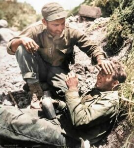 Fraternité dans le chaos L’image saisit un instant brut, presque insoutenable : deux Marines américains, épuisés, assis sur une colline rocailleuse près de Shuri, au cœur de l’île d’Okinawa. L’un vient de perdre un camarade, tombé sous les balles ou les éclats. L’autre, la main posée sur le front d’un camarade blessé, tente de lui offrir un réconfort que les mots ne sauraient donner. Okinawa, avril-juin 1945. C’est la dernière grande bataille du Pacifique, l’une des plus sanglantes. Les forces américaines, débarquées en masse, affrontent des défenseurs japonais retranchés dans des positions fortifiées (creusées à même la roche), et décidés à résister jusqu’au dernier homme. Les Marines et soldats américains découvrent un enfer : pluie d’artillerie, kamikazes, corps à corps dans les grottes, pertes immenses. Dans ce décor de boue, de flammes et de désolation, ce cliché révèle une autre vérité de la guerre : la fraternité. Quand tout s’effondre autour d’eux, les hommes ne tiennent que par les liens tissés entre compagnons d’armes. La mort est omniprésente, mais l’amitié, elle, devient une bouée. Okinawa a coûté la vie à plus de 12 500 Américains, et à près de 100 000 Japonais, soldats et civils mêlés. Le drame humain fut si terrible qu’il pèsera directement dans la décision d’utiliser l’arme atomique quelques mois plus tard, pour éviter une invasion du Japon métropolitain. Cette photo, figée dans la poussière et la douleur, raconte mieux que des chiffres ce qu’est la guerre : la perte, le chagrin, mais aussi la main fraternelle posée sur un visage.