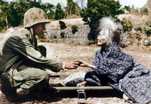 Un geste d’humanité – Okinawa juin 1945 Sur cette photo poignante, le caporal américain Fenwick H. Dunn, du corps des Marines, tend une sucrerie à une vieille femme okinawaïenne. Nous sommes le 1er avril 1945, jour du débarquement américain sur l’île d’Okinawa, dernière grande étape avant le Japon continental. La bataille d’Okinawa va devenir l’une des plus sanglantes du Pacifique, avec plus de 200 000 morts, militaires et civils confondus. Cette image nous interpelle : elle nous dit que même dans le chaos d’une guerre totale, des gestes de compassion demeurent. Le contraste est fort : d’un côté, un soldat casqué, tendu par les combats ; de l’autre, une femme âgée, fragilisée, hagarde, peut-être rescapée d’un bombardement ou de la terreur imposée par les troupes impériales japonaises, qui interdisaient toute reddition. Ce cliché incarne la dualité de la guerre : la destruction massive et la tendresse discrète, la violence brutale et la main tendue. Dans un monde ravagé, une simple friandise devient alors un acte de reconnaissance de l’humanité de l’autre. C’est cela aussi, l’histoire : une rencontre, un regard, un geste qui résiste à la barbarie.
