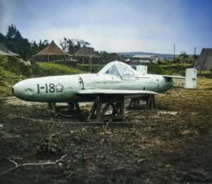 L’avion MXY7 Ohka Model 11 I-18, capturé à l’aérodrome de Yontan, Okinawa, Japon, en avril 1945.