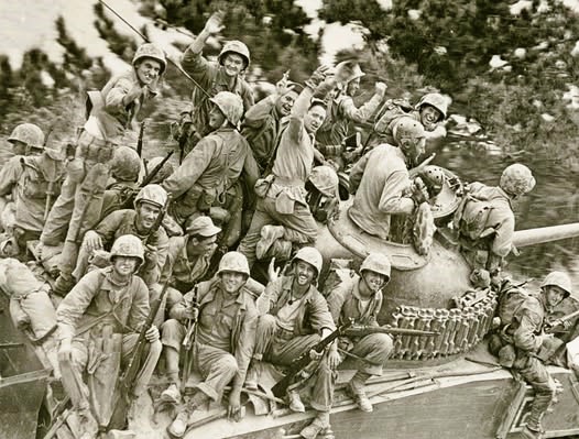 Les Marines montent au sommet d’un char M4A3 en direction du sud d’Okinawa