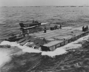 Mai 1945 sur Okinawa. Les marins du 70e bataillon de construction navale ont construit une barge à partir de pontons pour déplacer les hydravions PBM endommagés vers leurs bases de réparation.