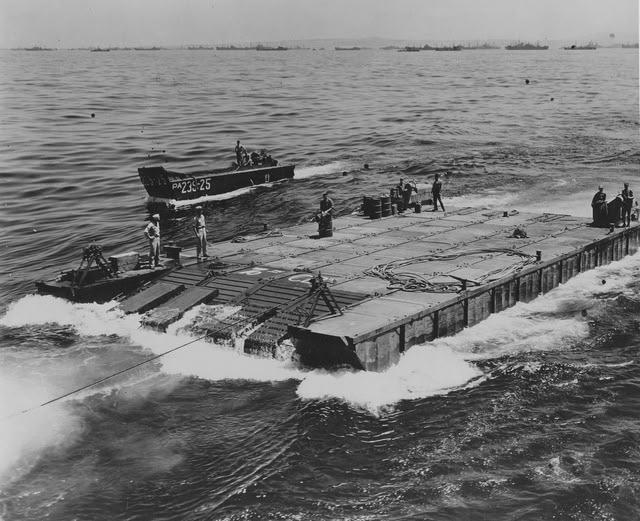 Mai 1945 sur Okinawa. Les marins du 70e bataillon de construction navale ont construit une barge à partir de pontons pour déplacer les hydravions PBM endommagés vers leurs bases de réparation.
