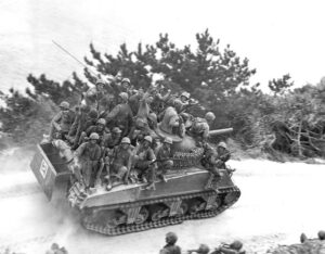 Une photo prise à Okinawa en avril 1945. Les membres du 29e Marines sur un char Sherman pour s’emparer de la ville de Ghuta avant que les Japonais ne puissent l’occuper.
