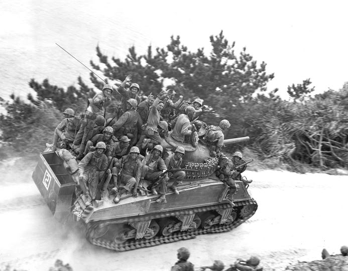 Une photo prise à Okinawa en avril 1945. Les membres du 29e Marines sur un char Sherman pour s’emparer de la ville de Ghuta avant que les Japonais ne puissent l’occuper.